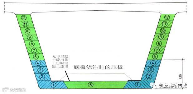 底板混凝土浇筑时在底部处设置压板,混凝土按照右图的顺序进行浇筑,混凝土自两侧腹板挤压出,将有助于腹板的捣实,避免腹板下部蜂窝。
