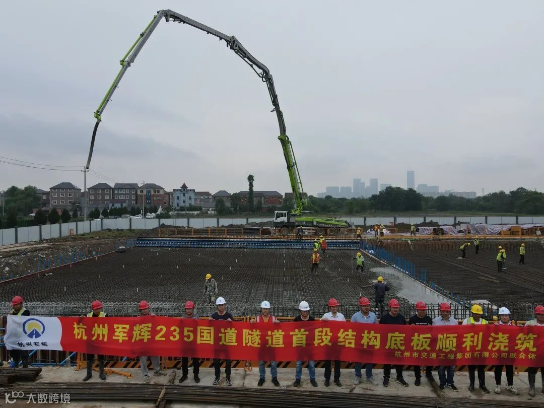 5月26日上午8点,机器轰鸣,人声鼎沸,235国道改建项目隧道主体结构首块底板混凝土浇筑工作顺利开始浇筑,约600方大体积混凝土的连续浇筑工作预计在晚上9点完成。