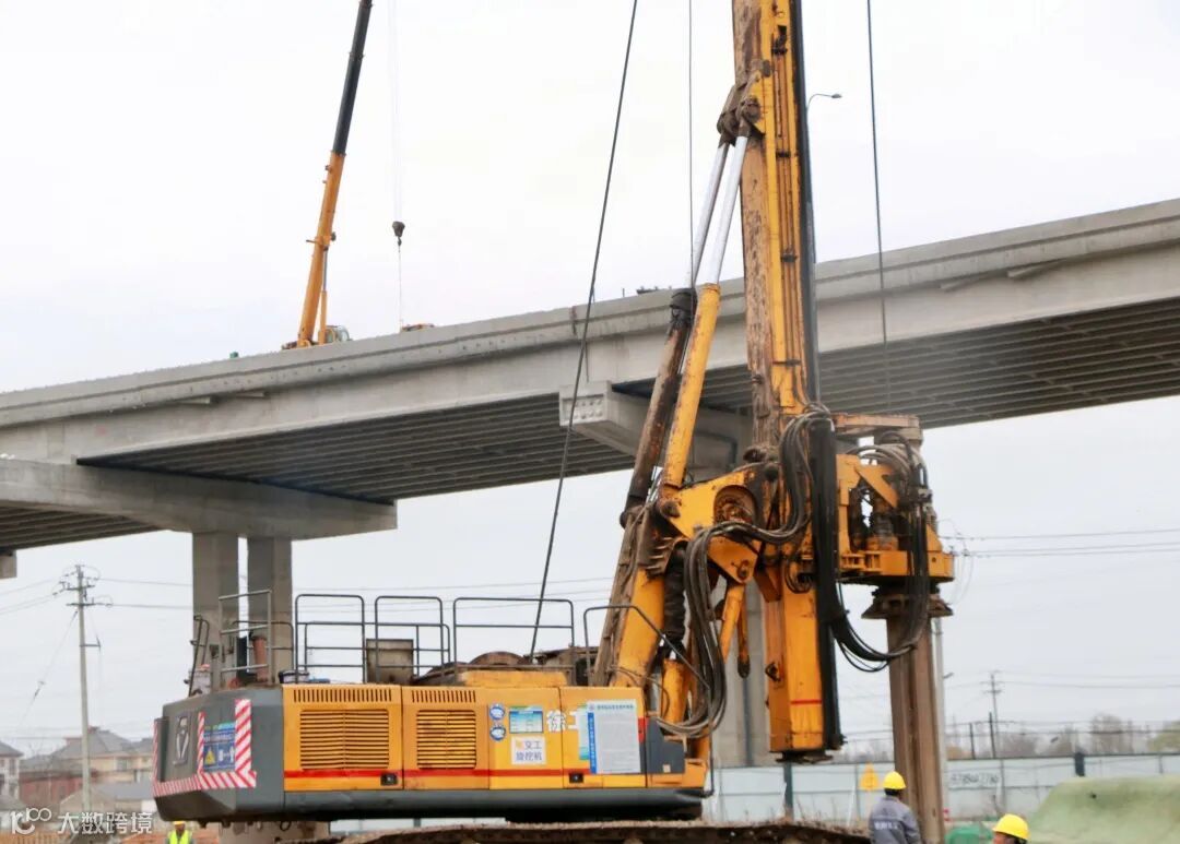 235国道改建项目互通区桩基现场已进入大规模施工模式,现场近50名建设者日夜倒班,4台旋挖钻机隆隆作响,呈现一片如火如荼的建设景象。