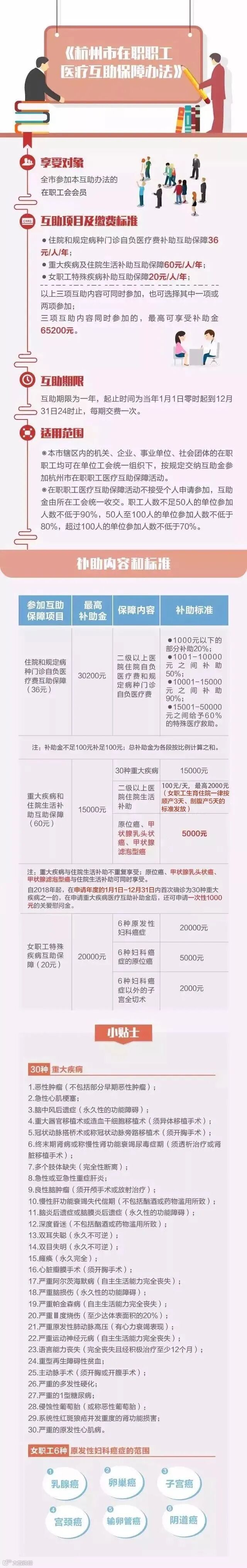 杭州市总工会推出的以互助互济为主要特征的《杭州市在职职工医疗互助保障办法》,包含了住院和规定病种门诊自负医疗费补助互助保障、重大疾病和住院生活补助互助保障、女职工特殊疾病补助互助保障三项内容,被许多杭州职工视为“第二医保”。换句话说,就是在医保范围之外,医疗互助相当于起了“二次报销”的作用。在一个互助周期内,最高补助金可达65200元。