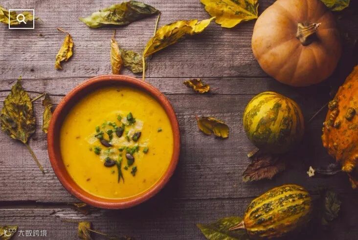 南瓜是最受欢迎的感恩节食材之一,在南瓜汤里加入洋葱和土豆慢慢熬制,直到形成粘稠状。食用时通常配上油煎面包。