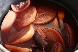 小火慢煮,待红葡萄酒颜色入果肉后盛起。