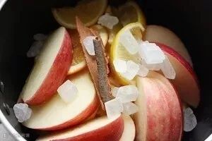 苹果、橙子、柠檬洗净切片,所有材料一起放入锅中。