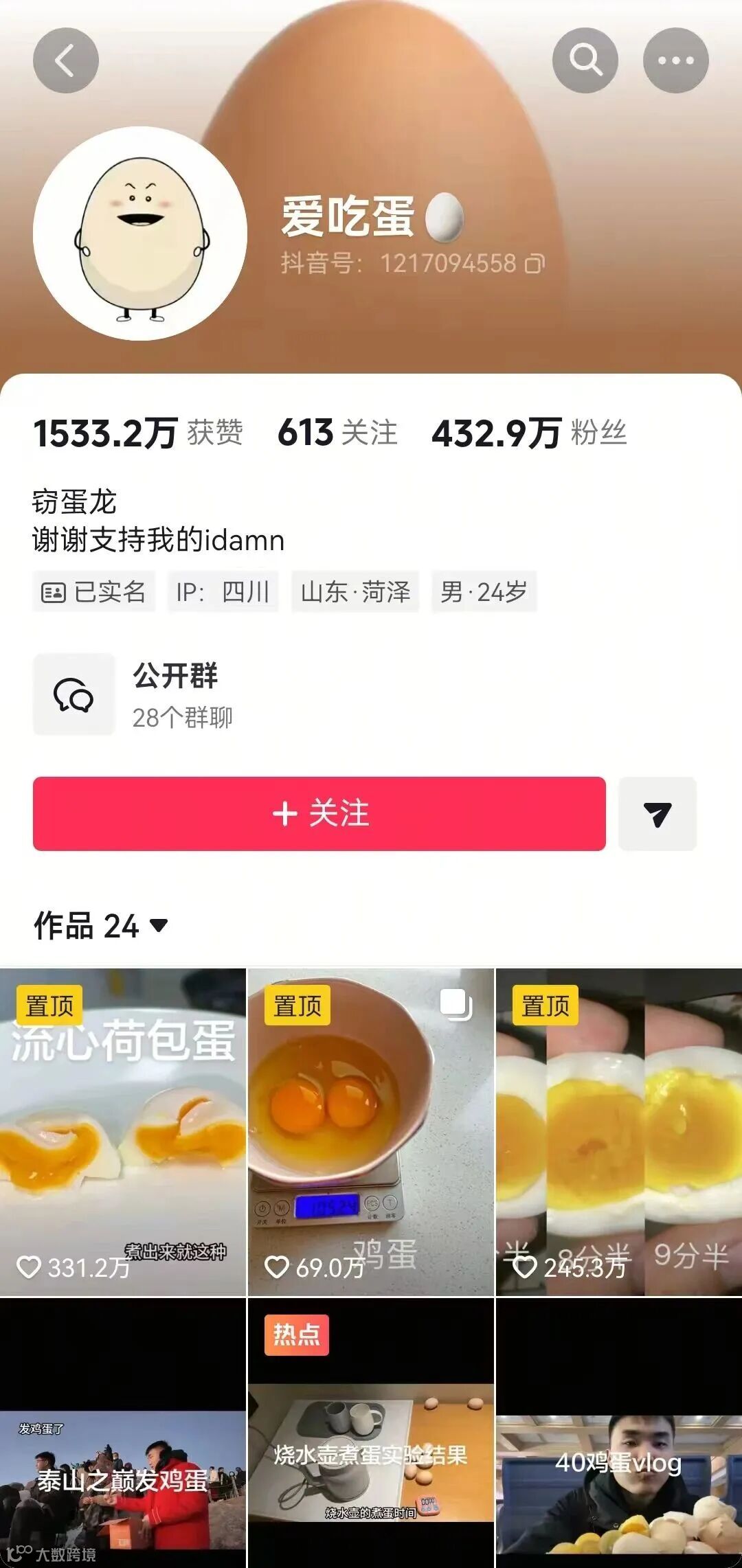 网红“蛋神”(账号“爱吃蛋”)因两条煮蛋评论爆火:网友晒出带“金沙纹路”的水煮蛋后,他精准给出“水开下蛋9分12秒捞出过凉水”的教程,并自称“一天吃40个蛋、连续五年”,短短几天涨粉超400万,全网掀起“抄作业”热潮,相关话题播放量达17亿。