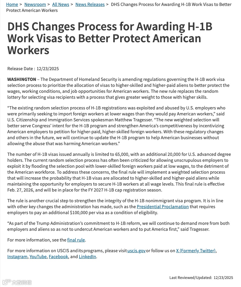 圣诞节前夕,美国国土安全部(DHS)正式公布H-1B工作签证抽签新规,从2026年2月27日起生效,将适用于FY2027(2027财年)H-1B抽签季。