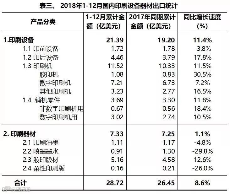 2018 年1-12 月,国内印刷设备出口21.39 亿美元,同比增长11.4%。
