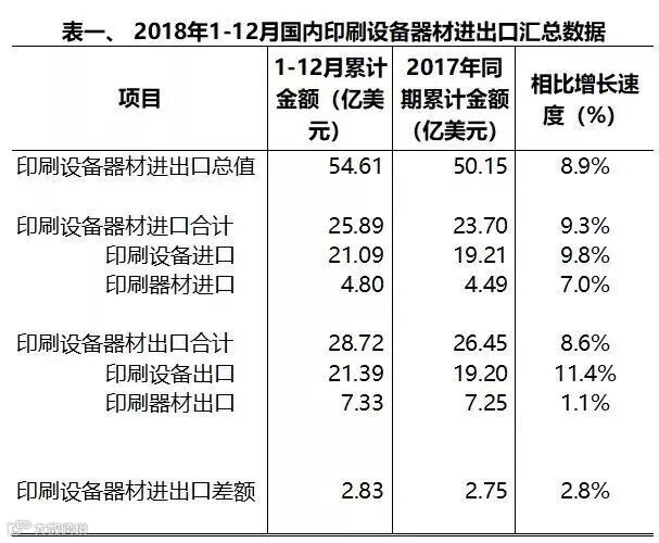 2018年1-12月,国内印刷设备及器材进出口总额54.61亿美元。与2017年同期相比,增长8.9%。