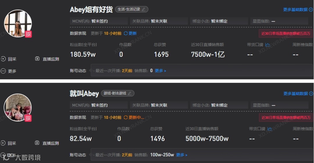 抖音主播Abey姐凭借独特的直播带货风格迅速走红,其两个账号“Abey姐有好货”和“就叫Abey”近30天的预估销售额分别达到7500万元至1亿元和5000万元至7500万元,累计接近2亿元。