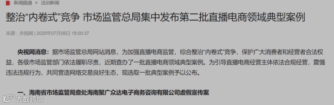 国家市场监管总局今年4月、7月分两批公布直播电商违法案例,共17起,其中虚假宣传问题尤为突出,占比均超半数。4月首批10起案例中,虚假宣传达5起;7月第二批7起案例中,海南聚广众达公司因虚构产品效果被罚200万元并撤照,创行业整顿新高。