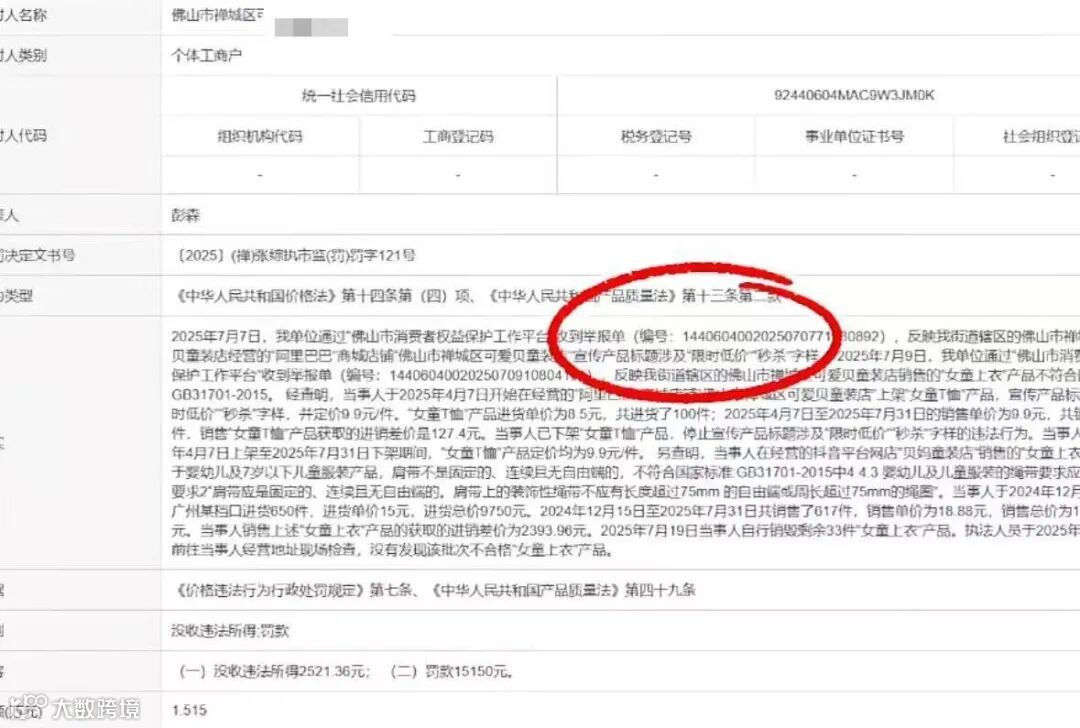 同时,其抖音店铺销售的 “女童上衣” 不符合国家强制性安全标准,最终被没收违法所得 2521 元,并处 15150 元罚款。