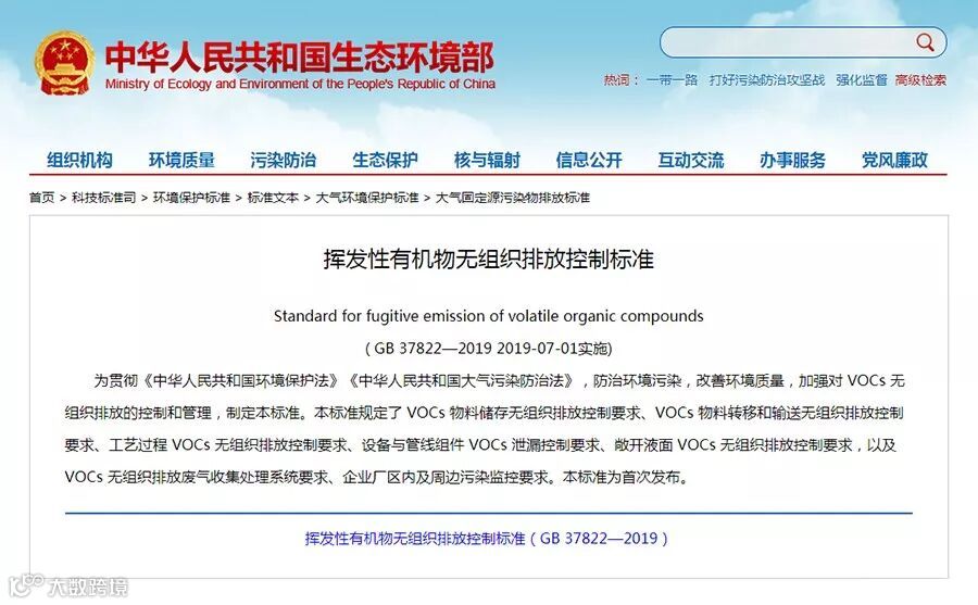 日前,生态环境部和国家市场监督管理总局联合印发《挥发性有机物无组织排放控制标准》(GB 37822—2019)。本标准为首次发布的国家标准,新建企业自2019年7月1日起,现有企业自2020年7月1日起,VOCs无组织排放控制按照本标准的规定执行。