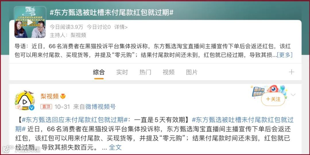 近日,有大量消费者在黑猫投诉平台反映称,东方甄选淘宝直播间主播宣传下单后会返还红包,该红包可以用来付尾款、买现货等,并提及“零元购”;结果付尾款时间还未到,红包就已经过期,导致其损失数百元。