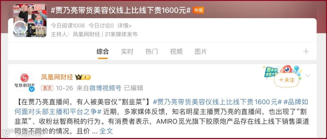 明星主播贾乃亮,在双11觅光美容仪专场直播中,推销的一款美容仪售价高达4599元。但是有网友发现,同款美容仪山姆线下店却仅售2999元,当天“贾乃亮带货美容仪线上比线下贵1600元”的话题便冲上了热搜。