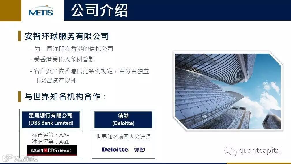 Quant Capital俱乐部,对冲基金、海外投资理财集中营。集合了私人银行、家族信托、私募基金、FOF组合、MOM、创投PE、Pre-IPO、定向增发、家族基金、海外保险、投资移民、海外置业、离岸公司等信息。整合全球优质海外金融资源,提供线上线下的沟通渠道支持服务,为高端客户和机构海外配置的新平台。