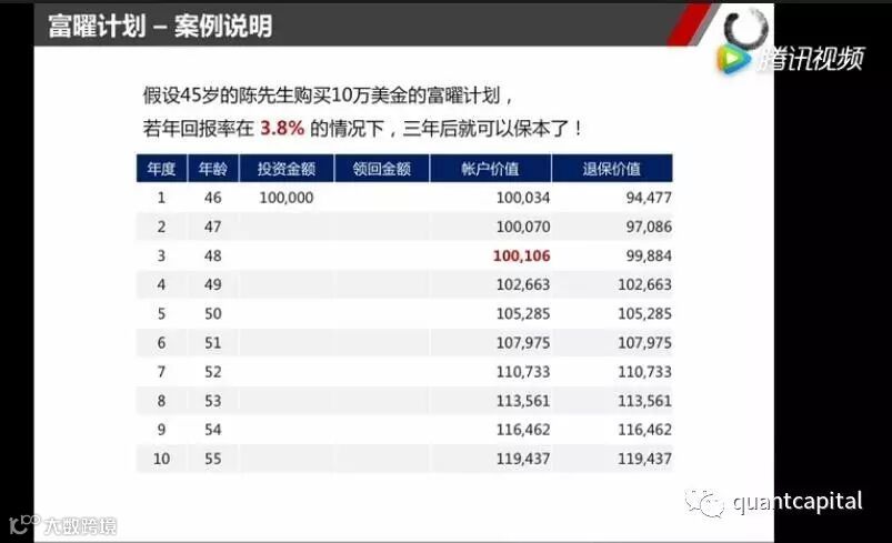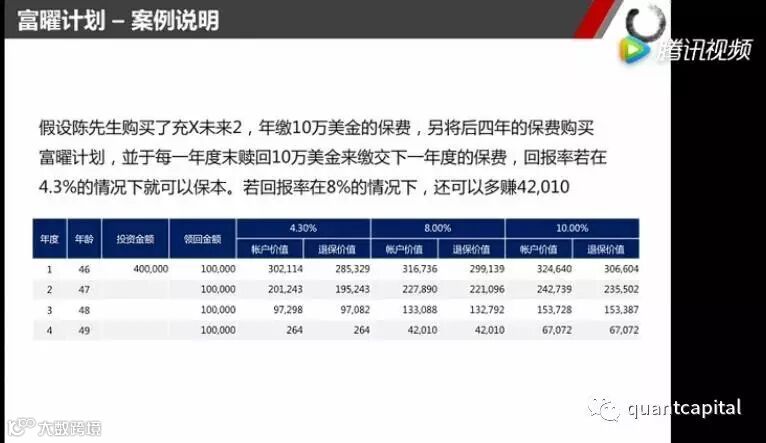 假设陈先生购买了5年计划充X未来2,每年10万美金,另外将后4年的保费购买40万美金的富曜计划,并且每一个年度末赎回10万美金来缴下一年的保费,回报率4.3%即可保本。回报率8%的话,还可以多赚42010。