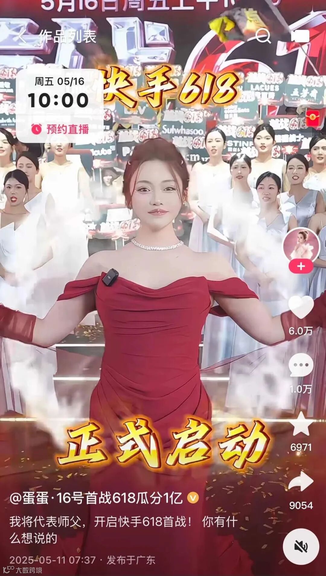 快手头部主播辛巴将重心押注在旗下主播蛋蛋身上,5月11日,蛋蛋宣布快手 618 启动,辛巴对她寄予厚望。