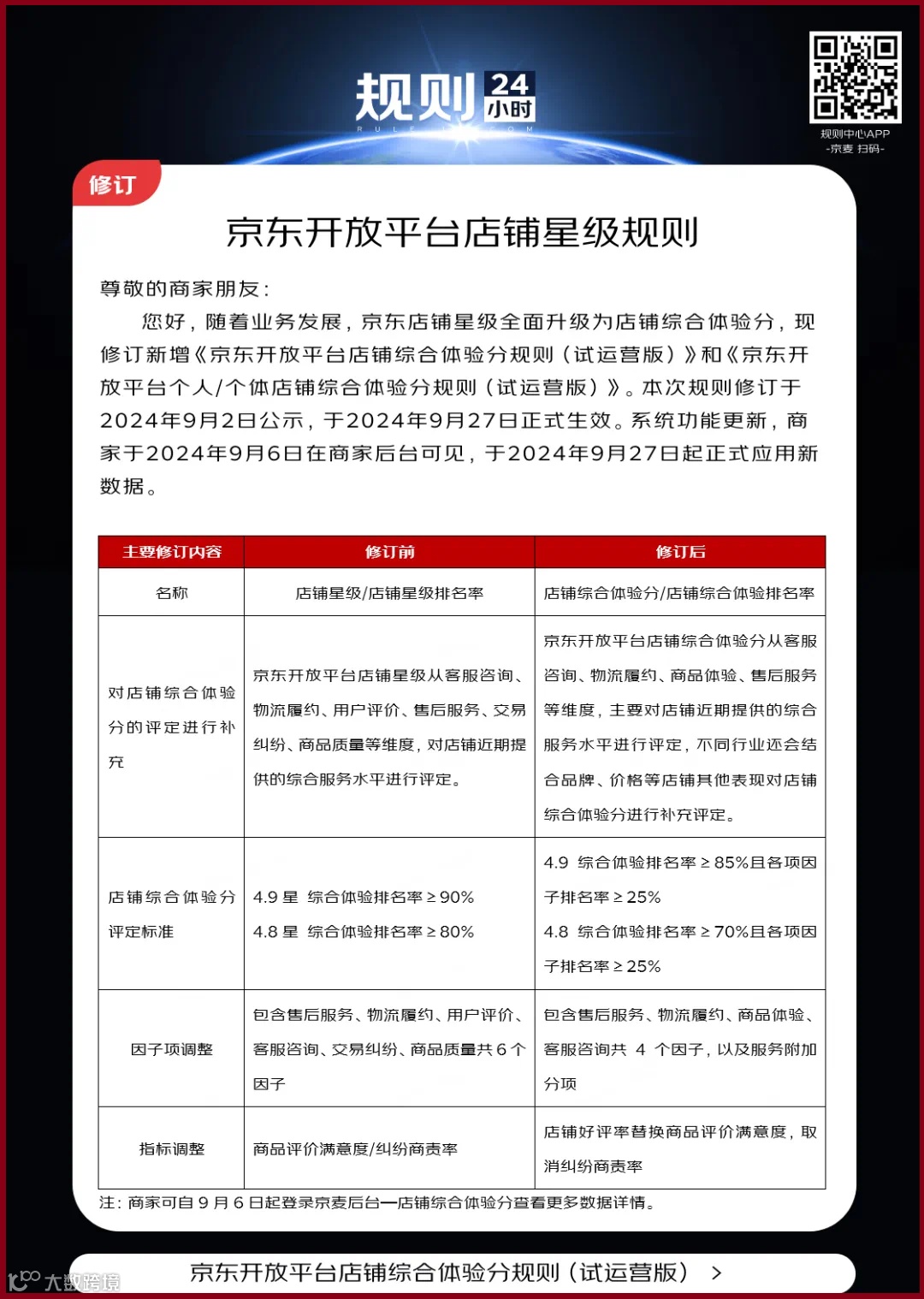 日前,京麦商家中心发布公告称,京东店铺星级将全面升级为“店铺综合体验分”。系统功能更新后,9月6日起商家在后台可见,9月27日起正式应用新数据。