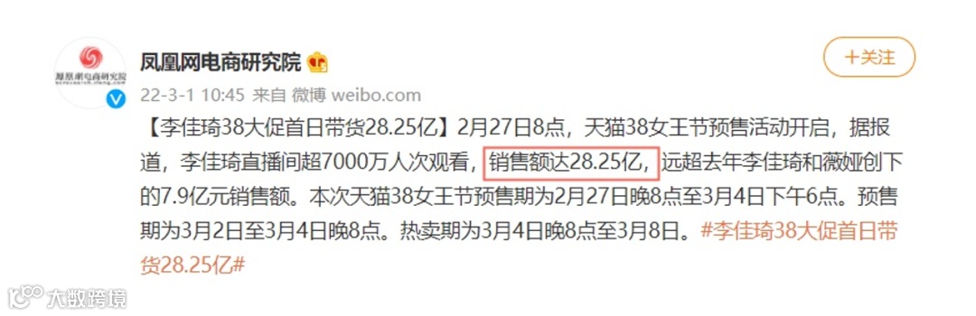 据报道,2月27日8点,天猫38女王节预售活动开启,李佳琦直播间超7000万人次观看,销售额达28.25亿元,远超去年李佳琦和薇娅创造的7.9亿元销售额。当日李佳琦直播间上架了近279款商品。