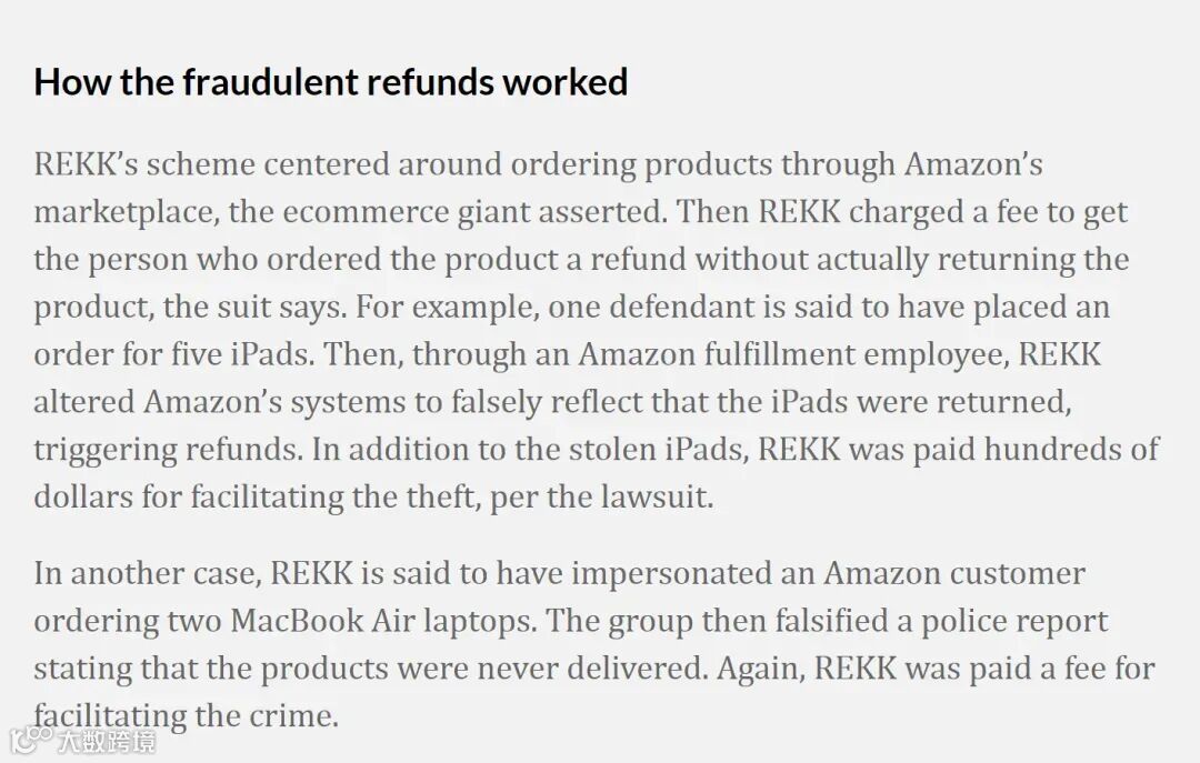 据外媒报道,亚马逊起诉了一个名为“REKK”的国际窃贼团伙,指控其利用“仅退款”的系统,从亚马逊窃取了价值数百万美元的商品。还有一个印度团伙利用亚马逊平台的“仅退款”政策漏洞,给平台造成了约2亿卢比(约合240万美元)的损失。这样的例子比比皆是,绝非个例。