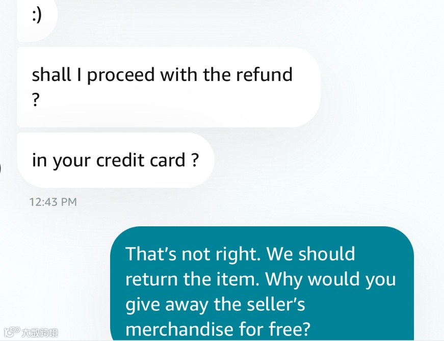 随着该政策的试行,亚马逊客服也开始有意识“训练“买家逃单。例如一位卖家联系亚马逊客服申请退货,并表示愿意承担退货运费,但是亚马逊客服的回复却让他感到震惊:申请全额退款,并保留货物,如下图所示: