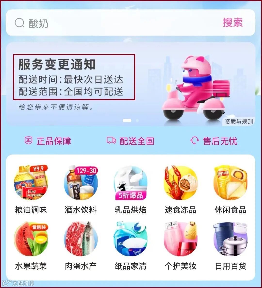 7月28日,每日优鲜App在首页置顶服务变更通知,通知显示,配送时间由原来的最快30分钟达改为最快次日送达,配送范围为全国可配送。