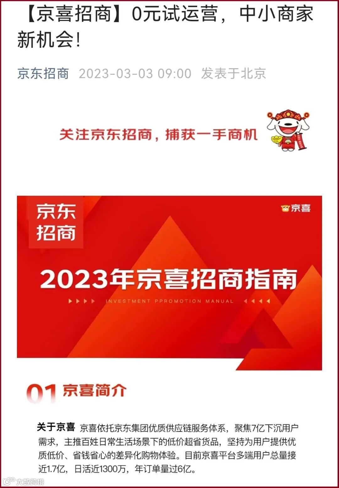 3月3日,京东招商公众号发布了京喜2023年招商指南。