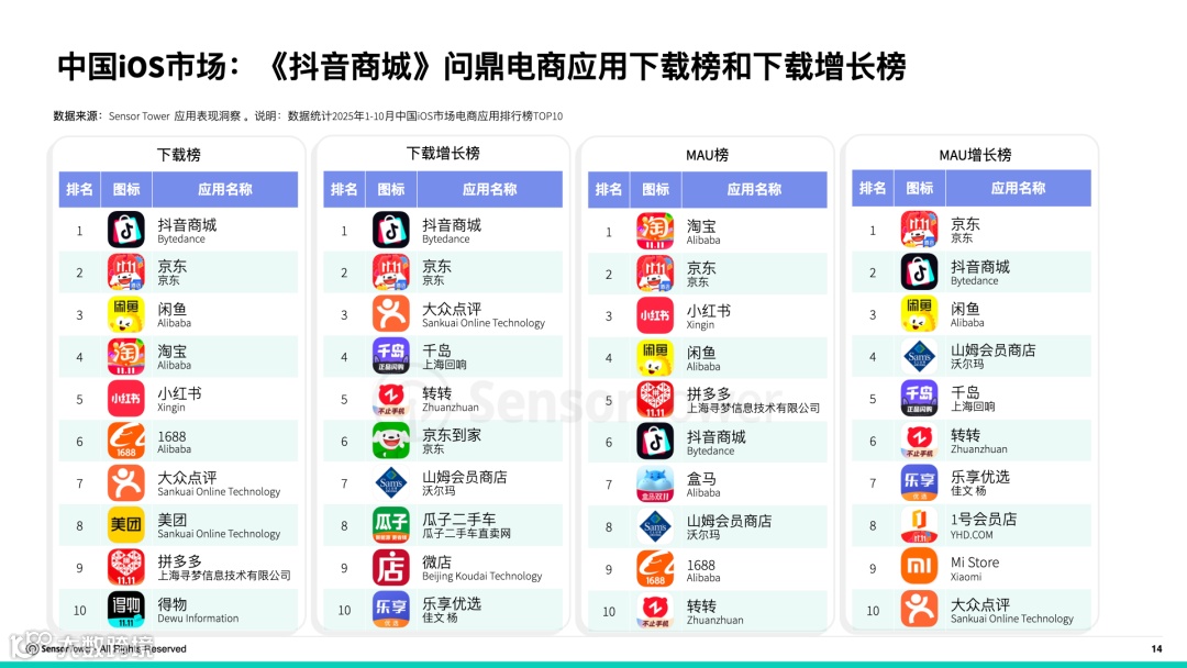 第三抖音商城(2024 年 3 月上线)是抖音首个独立综合电商平台,Sensor Tower 数据显示,2025 年 1-10 月中国 iOS 市场,它登顶电商下载榜与增长榜,依托短视频 + 直播带货的用户习惯,深度绑定流量与交易。