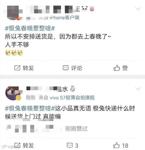对于一家快递企业来说,这无疑是致命的!在社交平台上,网友关于极兔的讨论负面居多,纷纷吐槽极兔“不急速”、服务态度差等等。甚至还有网友调侃极兔配送如此之慢,就是因为极兔快递员都去上春晚了。