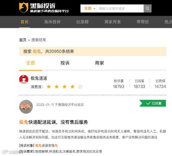 2022年第一季度快递服务满意率调查结果显示,极兔和德邦处于最低一档。截至2023年1月底,极兔在黑猫投诉接近19000条投诉,相当数量的投诉来自派送延迟,甚至有40天不派件的事情发生。