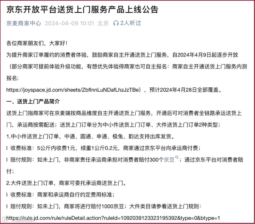 近日,京麦商家中心发布了《京东开放平台送货上门服务产品上线公告》。