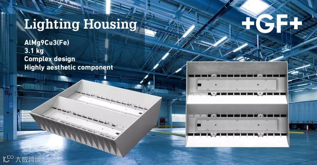 新型高效的LED照明技术的日益进步,点亮城市夜晚以及提高工业效率的同时,也让照明系统的设计变得灵活。这为照明外观壳体的设计制造提升了难度——我们需要将壳体设计的具有更高的美感以及更加精致的表面。图例中的照明系统壳体便是GF成型方案通过与客户密切的合作开发,配合铝合金高压压铸工艺的特点生产制作的。