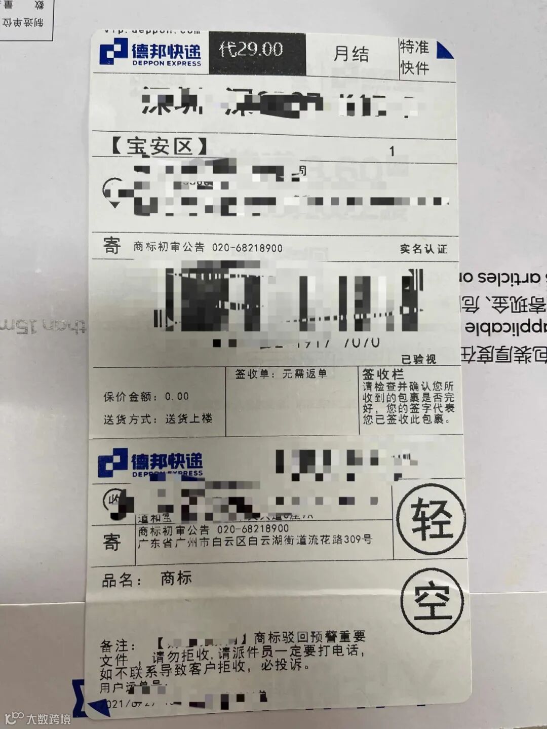 很多商标申请人看到这种文件都会当真,所以都是付完邮费直接签收。但其实这是骗子通过不同渠道获取商标申请人信息后,再伪造官方文件,快递到各商标申请人地址,用到付的方式来骗取钱财。