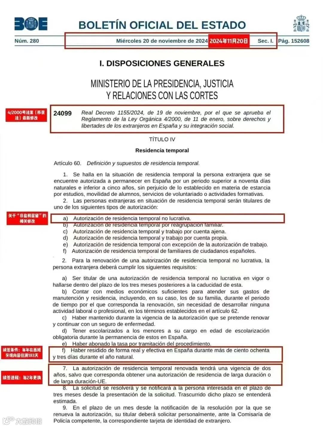 11月20日,西班牙国家官方公报网站(BOE.ES)正式发布了新的移民条例,对非盈利性居留(Residencia No Lucrativa,简称RNL)的续签条件进行了更新。