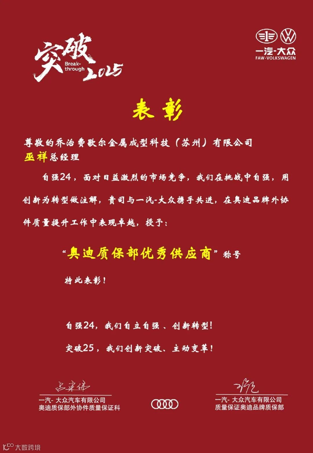 在这个充满荣耀与喜悦的时刻,我们很高兴地和大家分享:GF成型方案苏州公司有幸荣获了一汽大众奥迪质保部颁发的“奥迪质保部优秀供应商”称号。