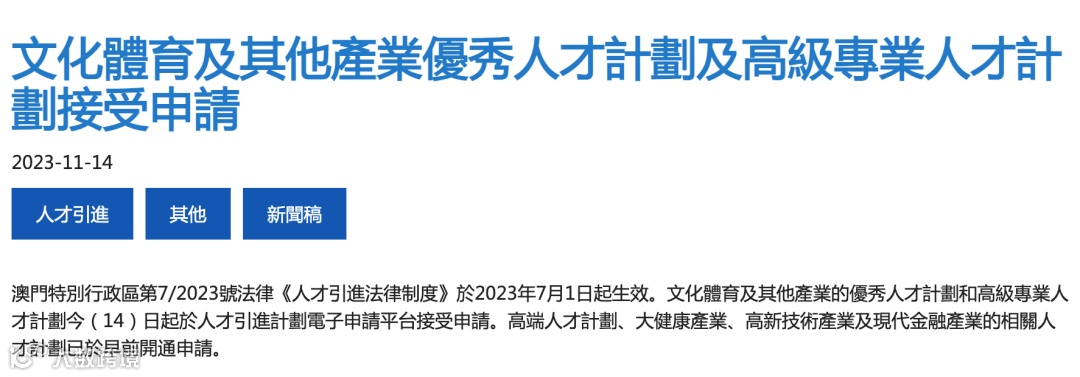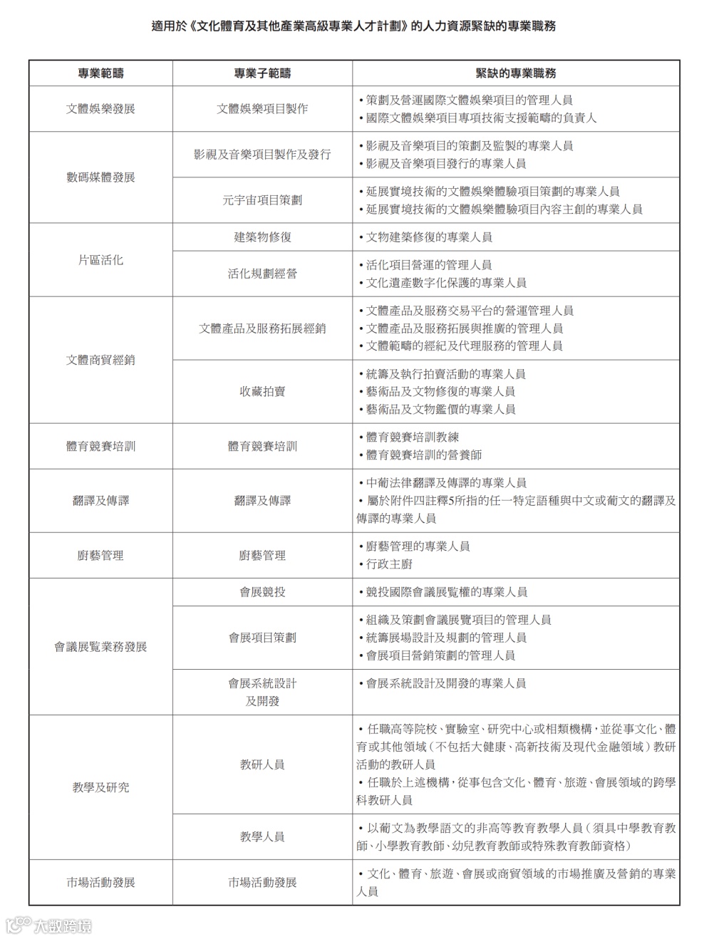澳门特区政府13日公布了文化体育及其他产业人才引进的专业范畴及申请要求,14日起接受申请。