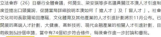 自澳门7月宣布要引进四大产业人才拿澳门身份、来澳门发展的消息一公布,立马引起全网沸腾!随着澳门人才引进法律制度正式生效,在此之前的三个月,官方陆续开展了高端人才、大健康产业人才、高新技术产业人才、现代金融人才引进计划,目前共收到申请529份,74人初步符合条件。