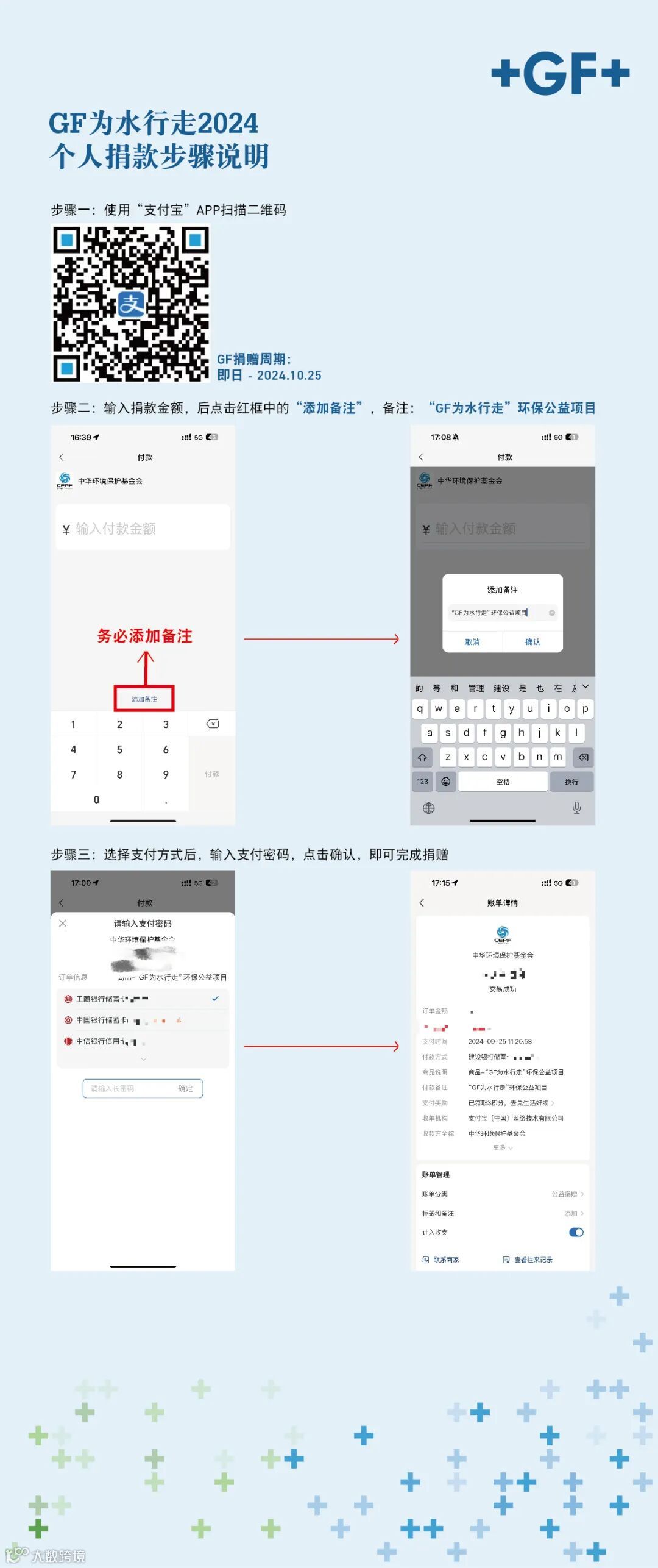 请务必明确捐款必须备注:“GF为水行走”环保公益项目