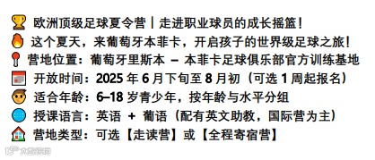 想象一下,今年夏天穿上本菲卡标志性的红色球衣,踏入培养了无数足球巨星的训练场,在葡萄牙夏日的阳光下,接受与欧洲顶级球员相同的训练,提升足球的对抗水平,拓展足球视野。这不是梦想,而是我们为热爱足球的孩子们精心打造的2025年足球夏令青训营!在这里,孩子们将沉浸在世界排名前列的青训体系中,与来自世界各地的足球少年一起,在本菲卡专业教练的指导下,开启一段足球与人生的蜕变之旅。