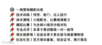 包括:球衣、短裤、球袜、训练背心等(具体按营期安排)。