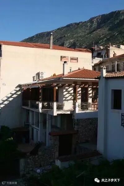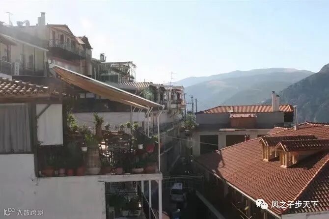 预订的酒店在第二条水平线上,老板娘给了位于顶楼风景最开阔的“全海景”房,所谓的海景就是远远可见的科林斯湾细细的一条水面,那对面就是伯罗奔尼撒半岛,这边属于希腊大陆。