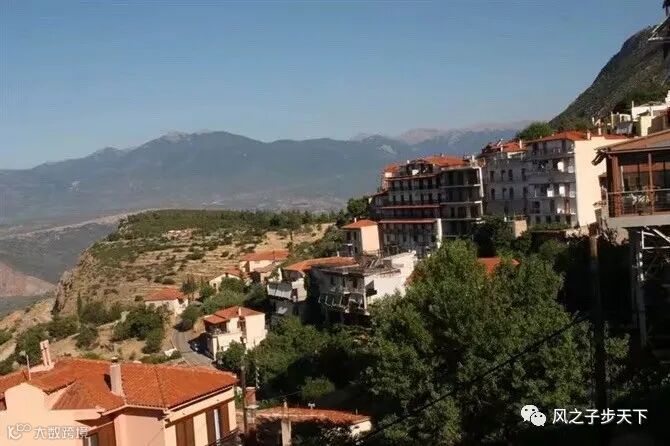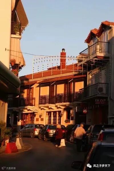 六点多到达一个建在山坡上的小镇,司机在镇口放下我们。科林斯湾远在山下露出一个小角,顺着山势坡度呈水平线排列的四条狭窄公路是小镇的主枝干,在不同高度错落着,各有自己的景观。