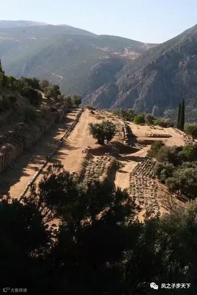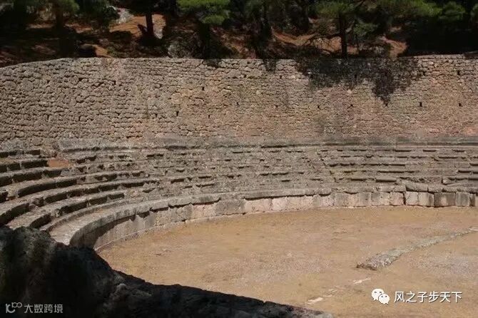 满头大汗地在骄阳中爬上山顶,一圈完整的看台围绕着巨大的椭圆形古代运动场实在有些出人意料,虽然这次没来得及安排前往奥林匹亚,但估计奥林匹亚也不会找到保存如此完整的古运动场了,它几乎没有一点损坏,上百米长的看台上整齐的座位可以轻易坐下几千观众。在古代希腊,运动场也是祭祀的场所,是神圣的地方。