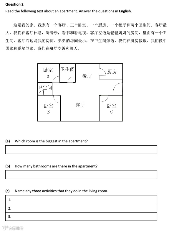 一张家庭平面图和中文介绍,要求写出最大的房间,以及3种客厅里的活动等。