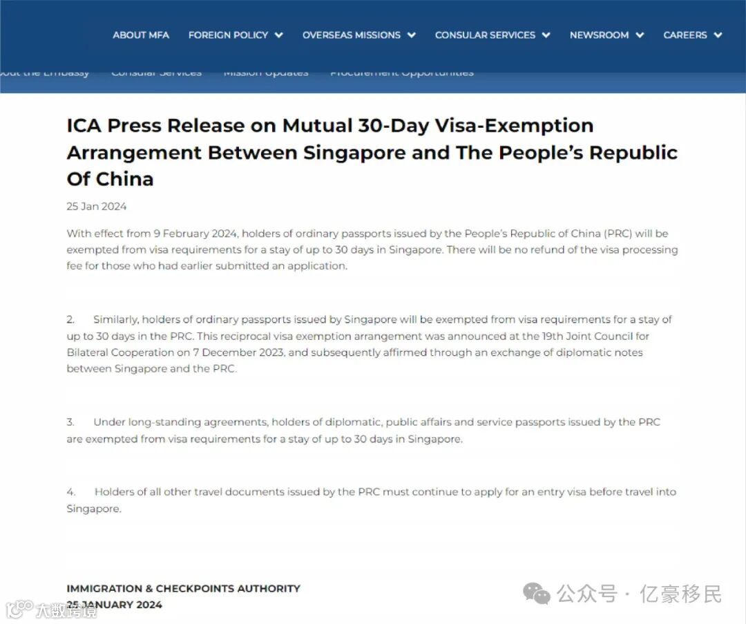 2024年2月9日起,《中华人民共和国政府与新加坡共和国政府关于互免持普通护照人员签证协定》正式生效,双方持普通护照可免签入境对方国家停留不超过30日。