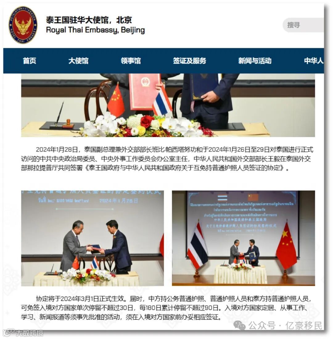 1月2日泰国总理表示,2024年3月起泰国对中国实施单次停留不超过30天且180天多次累计停留不超过90天的免签政策。