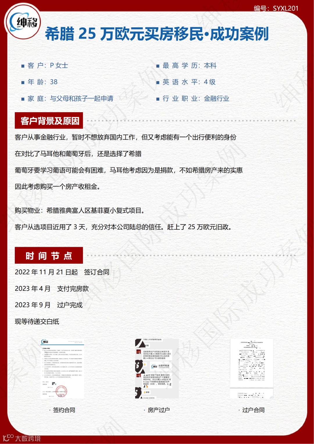 作为提供一站式移民解决方案的服务机构,绅移国际团队为P女士制定了完善的希腊买房移民计划。
