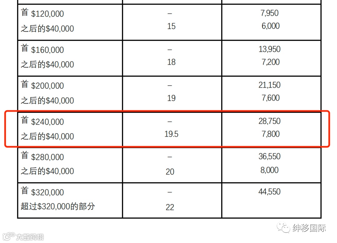 28750+(280000-240000)*19.5%=28750+5850=34600新币/年*5.38的汇率