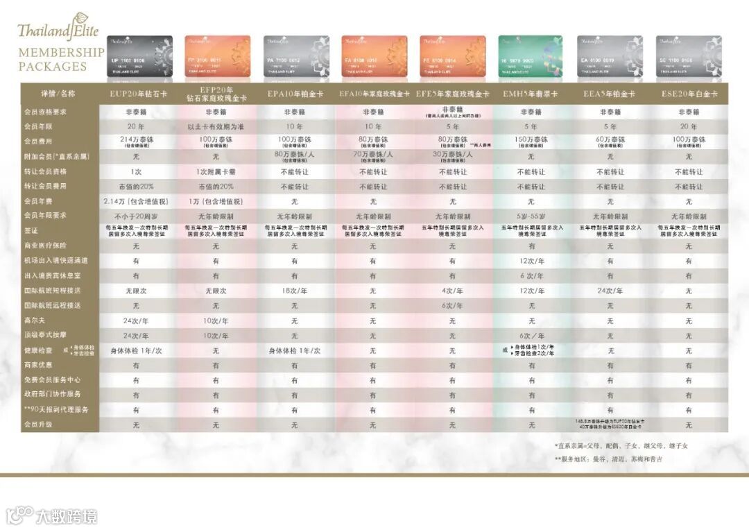 泰国国家尊荣卡机构的套餐根据以上的需求,设计了七种不同年限,服务的套餐: