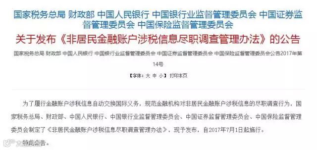 科普之后,应该来说说消息源头:国税局在今年5月发布的《非居民金融账户涉税信息尽职调查管理办法》