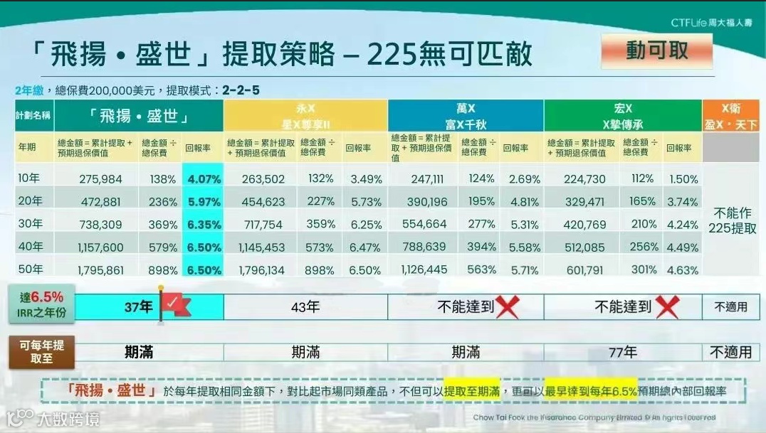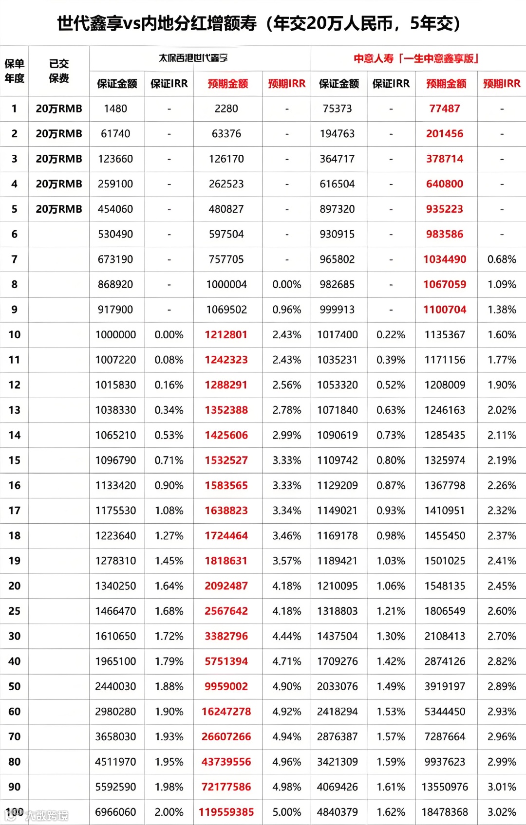 核心优势:依托百年险企品牌背书,6年即可回本;10年预期IRR达4.29%,20年IRR突破6%,且前20年资金提领灵活。